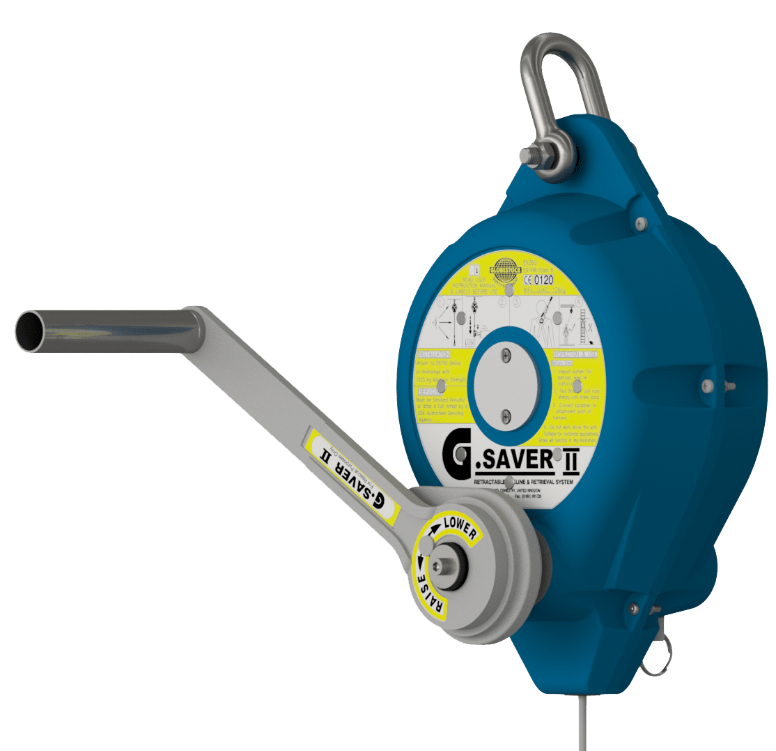 The G.Saver is a fall arrest block that features a rescue winch for raising or lowering a fallen person to safety.