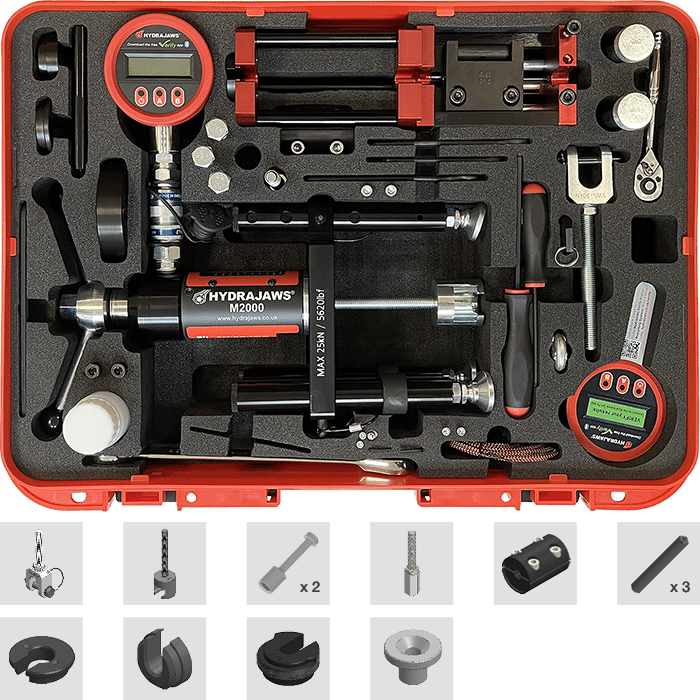 The Hydrajaws M2000 Safety Lifeline Cable Tester Kit 2 is a complete kit designed to help engineers validate the installation of anchors, eyebolts, and swaged components in lifeline systems. It ensures compliance with BS 7883, supporting tensile loads up to 25kN (5620lbf).